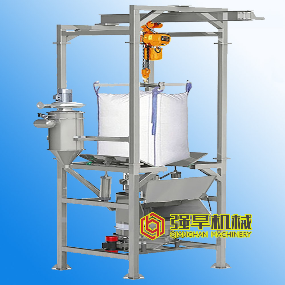 1.通過叉車或打開安裝在噸袋拆包機設備支架上的電動葫蘆開關,操縱叉車或者將噸袋固定在噸袋吊架上提升至進料口——注意將噸袋固定到吊架上移動到高處時,噸袋下方不要站人。